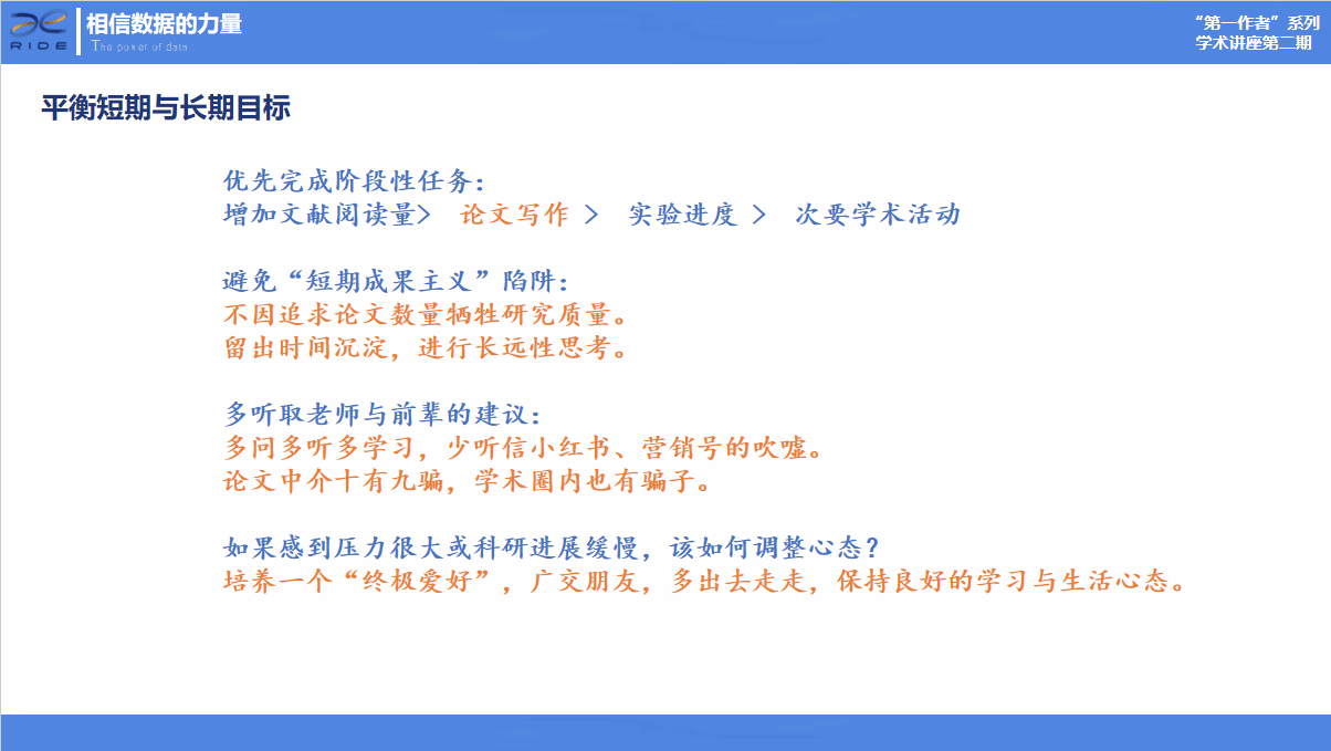 在学术目标规划方面,陈建硕博士分别从短期学术目标以及长期学业生涯这两个维度切入展开分享。短期学术目标上,陈建硕博士强调硕士生与博士生各有明确任务。硕士生要确立研究主题、掌握技能、积累成果、完成学位要求并为后续发展攒资源;博士生需明确课题、制定计划、培养能力、发表论文、拓展关系网并保持良好心态。长期规划需要依次确定研究方向、学术目标、积累核心能力、关注就业。同时,为平衡短期与长期目标,陈建硕博士提出优先完成任务、避免“短期成果主义”、多听建议、调整心态等方法,提醒大家在学术道路上注重方法与心态平衡,稳步前行。