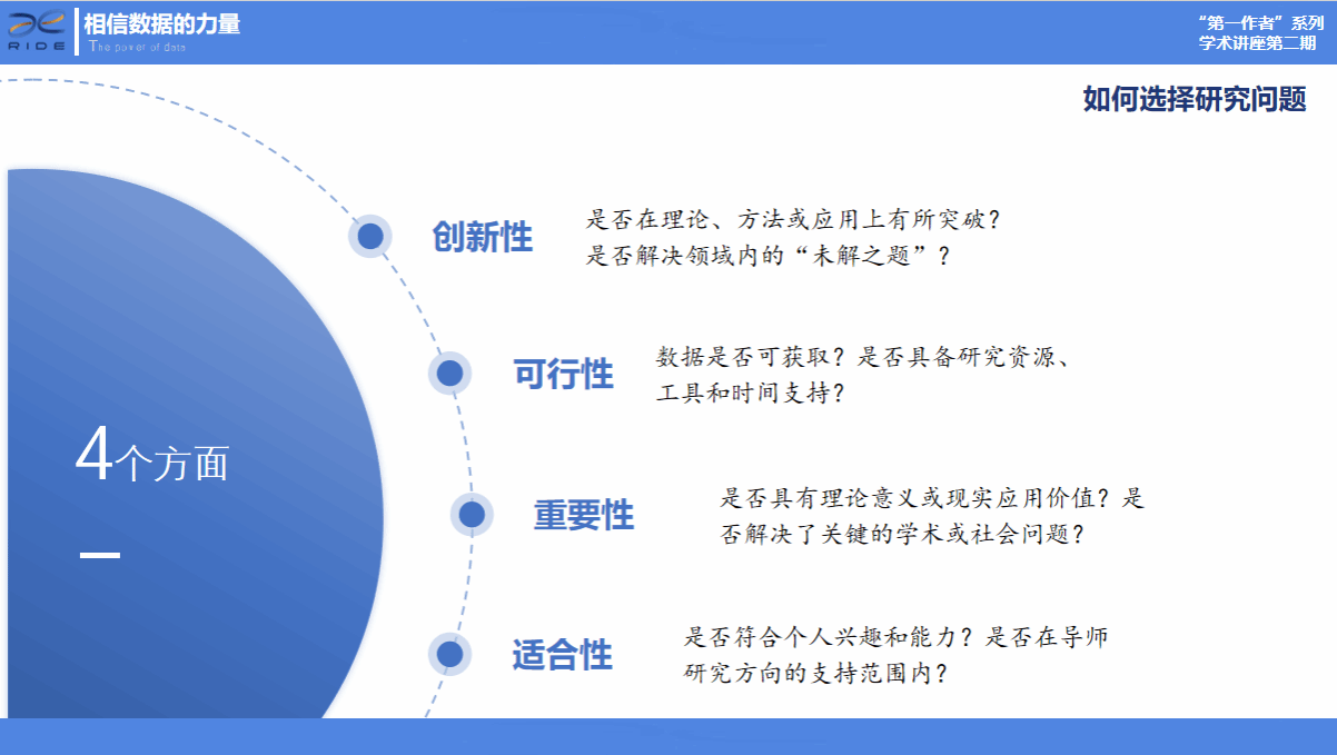 在如何找到研究问题方面,陈建硕博士提供了一些宝贵的建议。他指出,研究问题的寻找路径有四条:其一,参考导师意见,了解导师项目,从中挑选可参与或拓展的部分;其二,实践观察,可在学科竞赛中与其他学校学生交流,或与企业、机构、用户沟通等途径,以现实环境为依托发现问题;其三,运用文献阅读法,在阅读文献时挖掘研究空白,拓展研究方向;其四,尝试跨学科融合,将两个学科的理论与方法结合,创造新的研究问题。同时,在选择研究问题时,可从研究的创新性、可行性、重要性与适合性四个维度进行考量。
