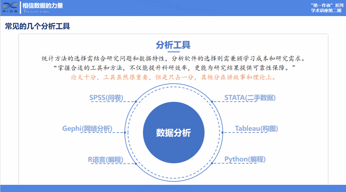 在如何找到分析工具方面,陈建硕博士认为不同的数据分析工具适用于不同的研究问题和数据类型。他指出无论是处理问卷数据的SPSS,还是进行网络分析的Gephi,又或是编程能力强大的R语言和Python,每一种工具都有其独特的优势。选择合适的工具不仅可以提高工作效率,还能确保研究结果的准确性和可靠性。在进行数据分析时,他建议同学们不能仅仅依赖于某一种工具,而是要根据具体的需求灵活选择和组合使用这些工具,这样才能更好地挖掘数据背后的价值,为科学研究和实际应用提供有力支持。