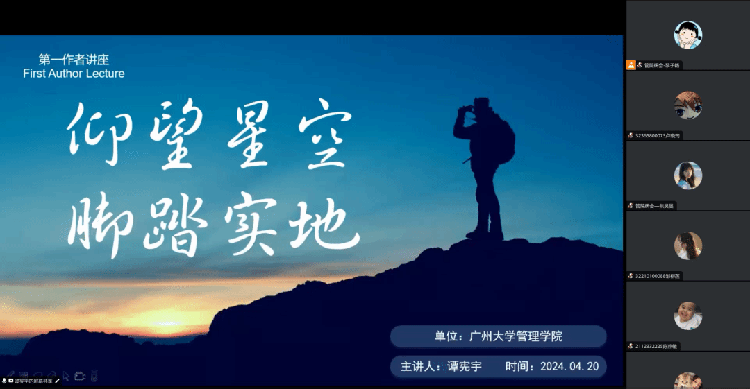 谭宪宇博士首先谈到了“仰望星空与脚踏实地”的主题,强调了在学术道路上坚持追求目标的重要性。他认为,学术追求是一个不断积累和耐心等待的过程,需要有理想和动力的双重支撑。
